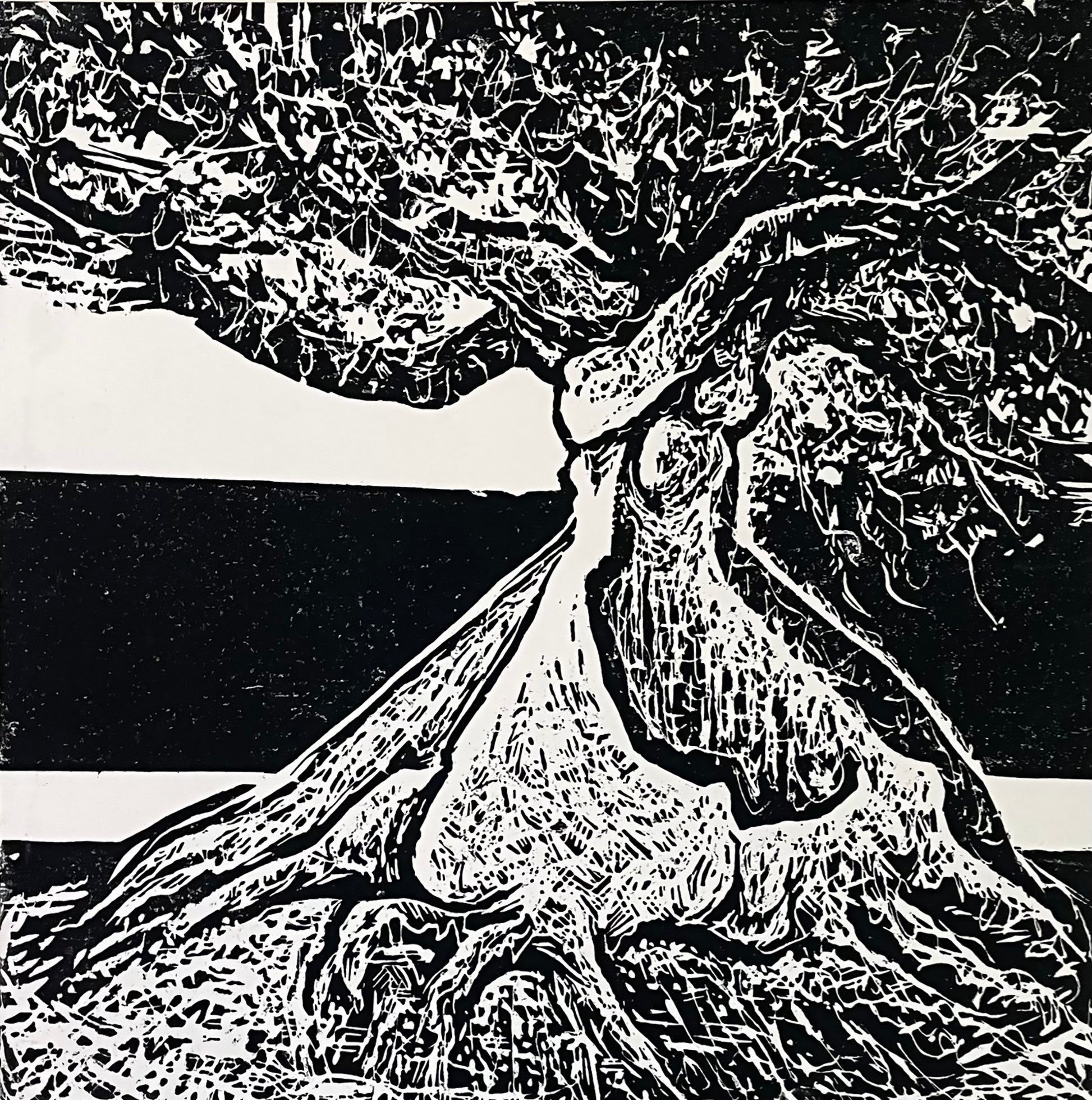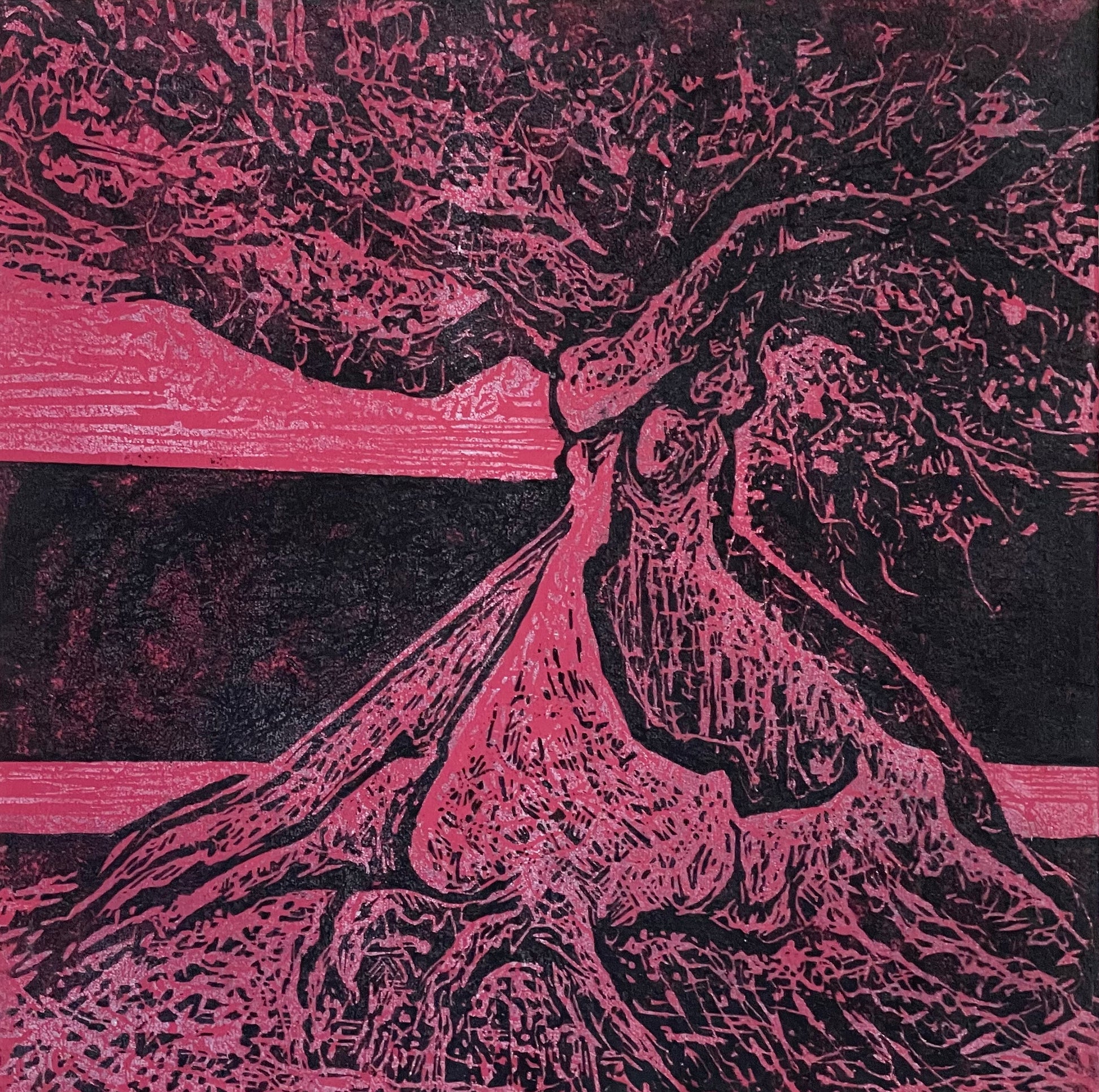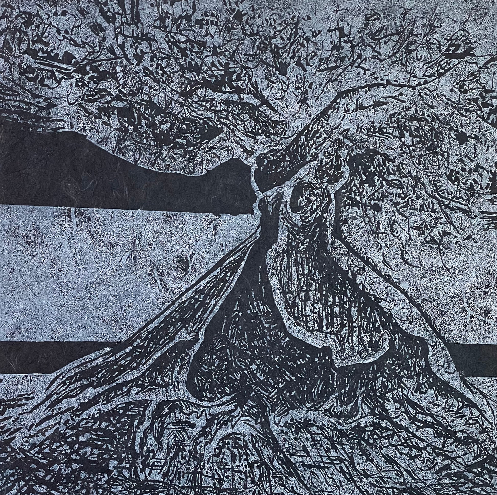 Ceiba tryptic, woodcut printed on different papers and different colors, 2023, 12" x 12"